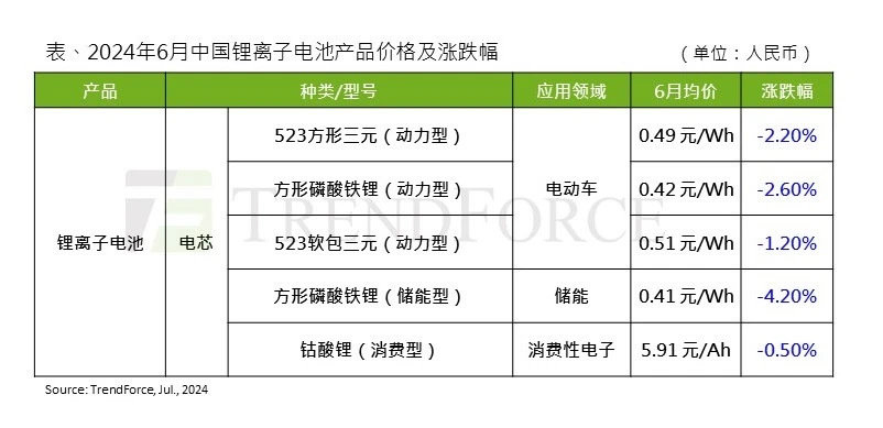 动力电芯 方面,TrendForce集邦咨询统计,6月动力电芯价格环比下跌1-2%,其中方形三元、方形铁锂和软包型三元动力电芯月均价分别为0.49元/Wh、0.42元/Wh和0.51元/Wh。