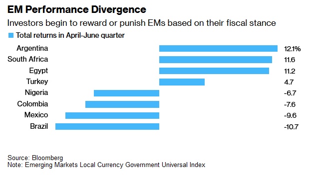 这在第二季度的新兴市场政府债券表现中有所体现。表现最好的新兴市场债券背后的国家——包括阿根廷、土耳其和埃及——都在进行财政改革;而表现不佳的新兴市场政府债券背后是赤字不断增长的国家,如墨西哥和巴西。