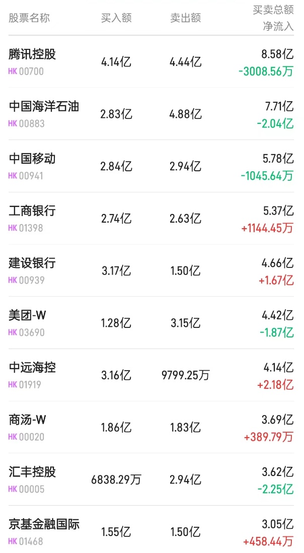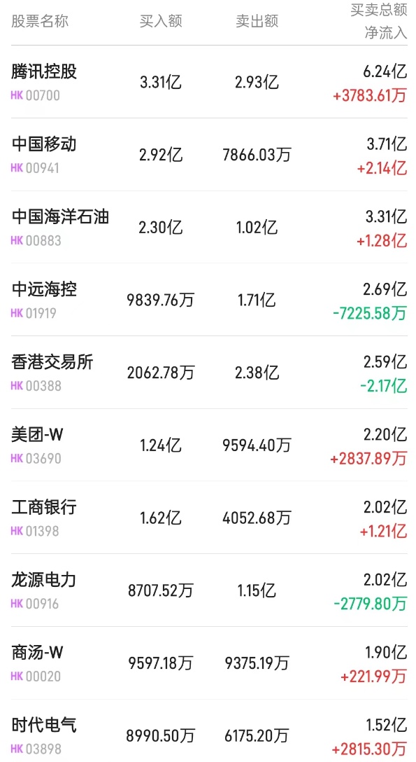 此外,时代电气(03898)、腾讯(00700)分别获净买入2815万、775万港元。而中海油(00883)遭净卖出7585万港元。