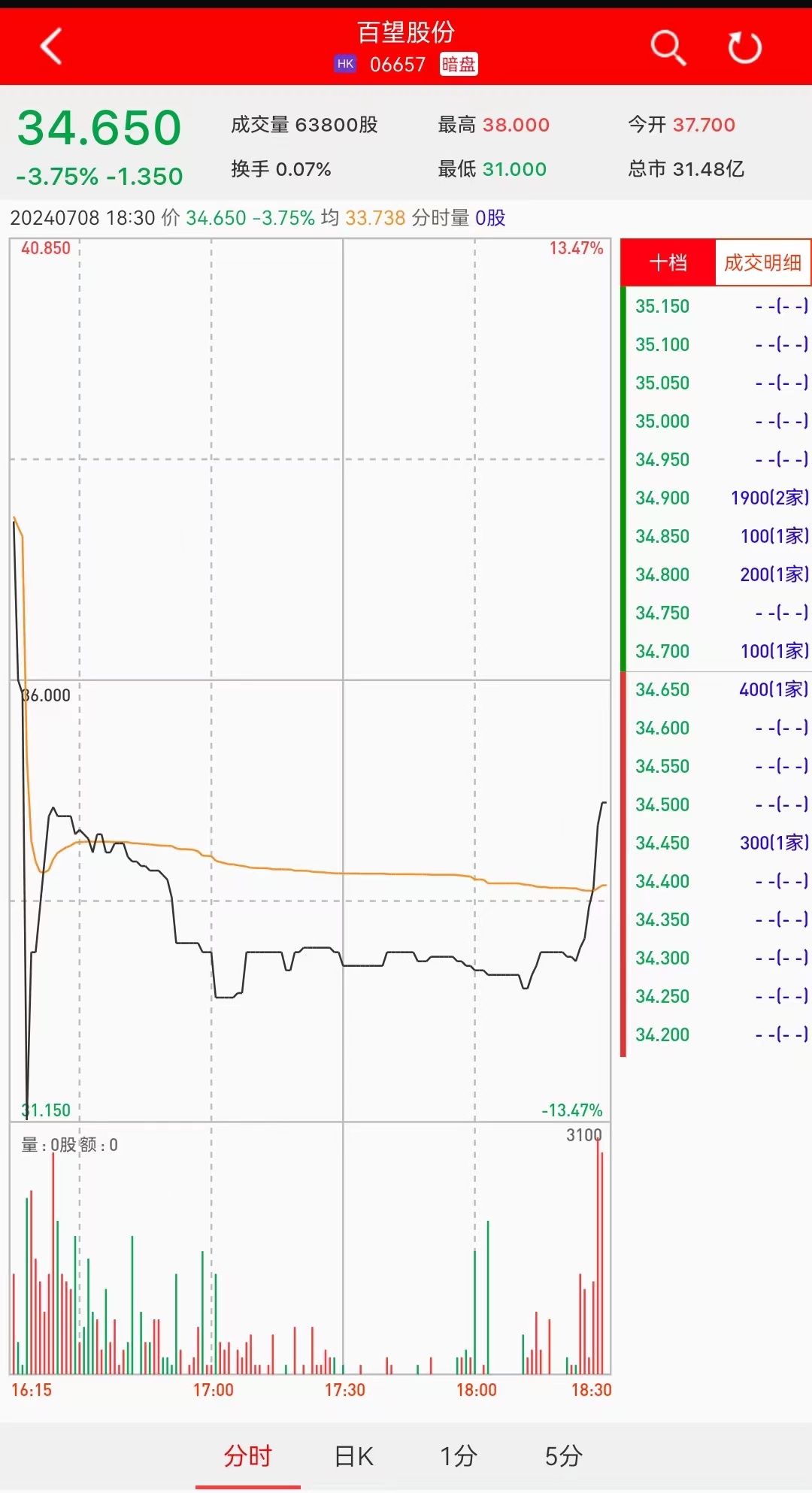 智通财经APP获悉,百望股份(06657)将于7月9日(周二)在香港挂牌。截至收盘,利弗莫尔证券暗盘交易显示报价34.65港元,较招股价36港元下跌3.75%。每手100股,不计手续费,每手亏135港元。