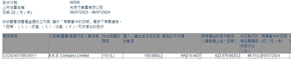 智通财经APP获悉,香港联交所最新资料显示,7月5日,B.K.S. Company Limited增持先思行(00595)10万股,每股作价为0.4437港元,总金额约4.44万港元。增持后最新持股数目约为1.23亿股,持股比例为46.51%。