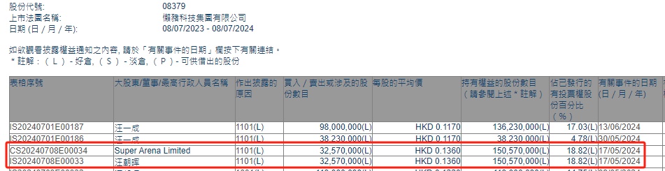 智通财经APP获悉,香港联交所最新资料显示,5月17日,Super Arena Limited增持懒猪科技(08379)3257万股,每股作价为0.1360港元,总金额约442.95万港元。增持后最新持股数目约为1.51亿股,持股比例为18.82%。