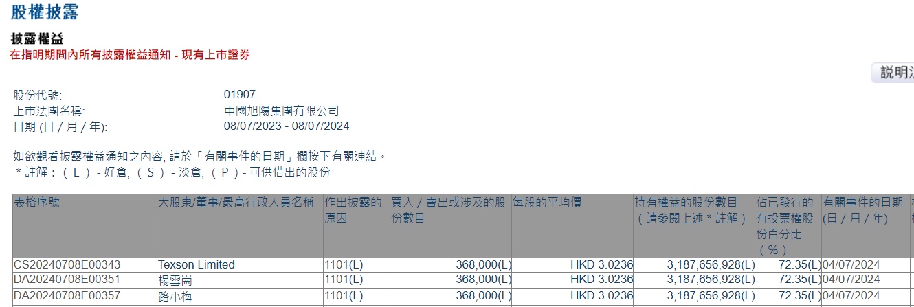 Limited增持中国旭阳集团(01907)36.8万股,每股作价3.0236港元,总金额约为111.27万港元。增持后最新持股数目约为31.88亿股,最新持股比例为72.35%。