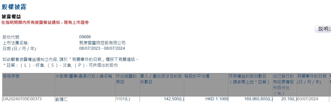 智通财经APP获悉,香港联交所最新资料显示,7月3日,董事长刘积仁增持熙康云医院(09686)14.25万股,每股作价1.1068港元,总金额约为15.77万港元。增持后最新持股数目约为1.70亿股,最新持股比例为20.19%。