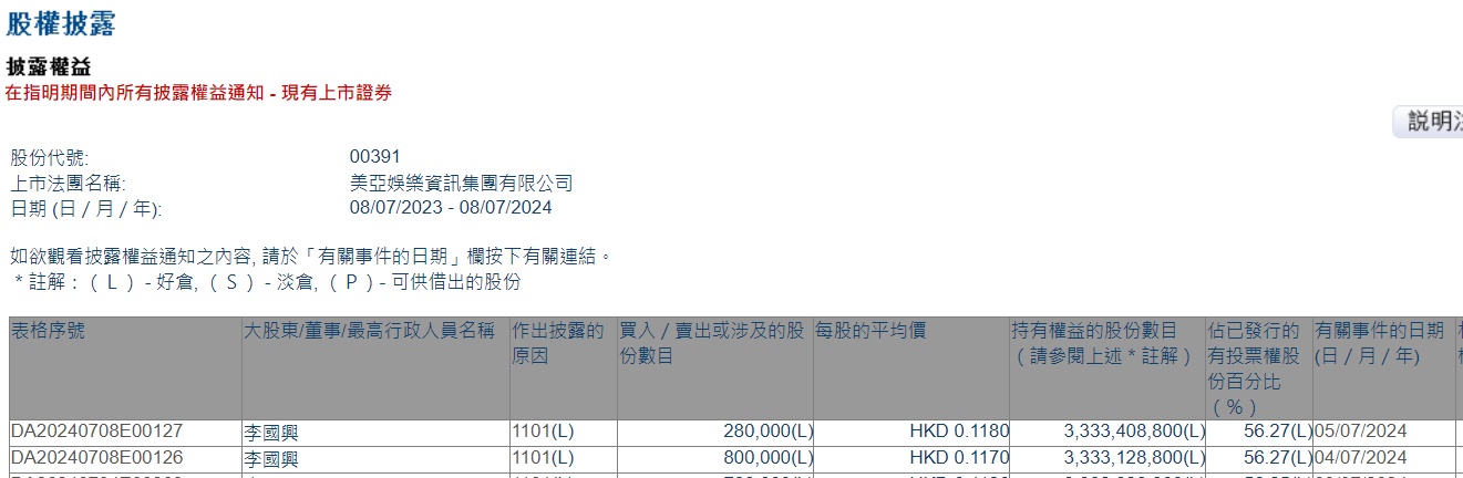 智通财经APP获悉,香港联交所最新资料显示,7月4日、7月5日,执行董事兼主席李国兴分别增持美亚娱乐资讯(00391)80万股、28万股,每股作价分别为0.117港元、0.118港元,涉及总金额12.664万港元。增持后最新持股数目约为33.33亿股,持股比例为56.27%。