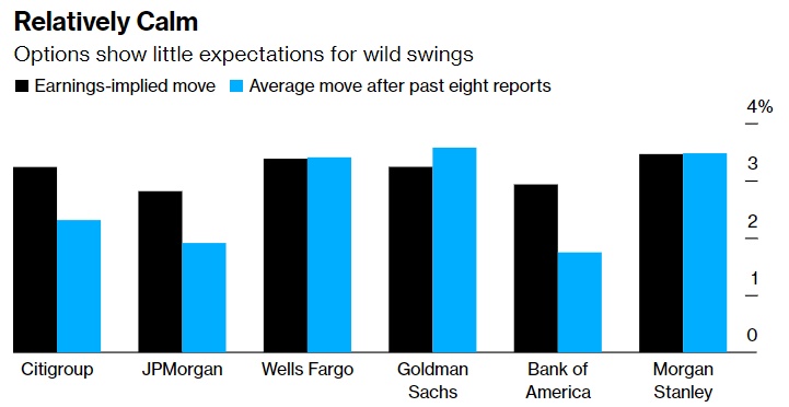 就财报公布后的波动性而言,期权反映的股价走势或多或少与以往财报公布后的走势一致。市场目前预计,富国银行和摩根士丹利(MS.US)的股价波动最大,涨幅或跌幅为3.4%,与它们过去8个季度财报的平均走势相符。