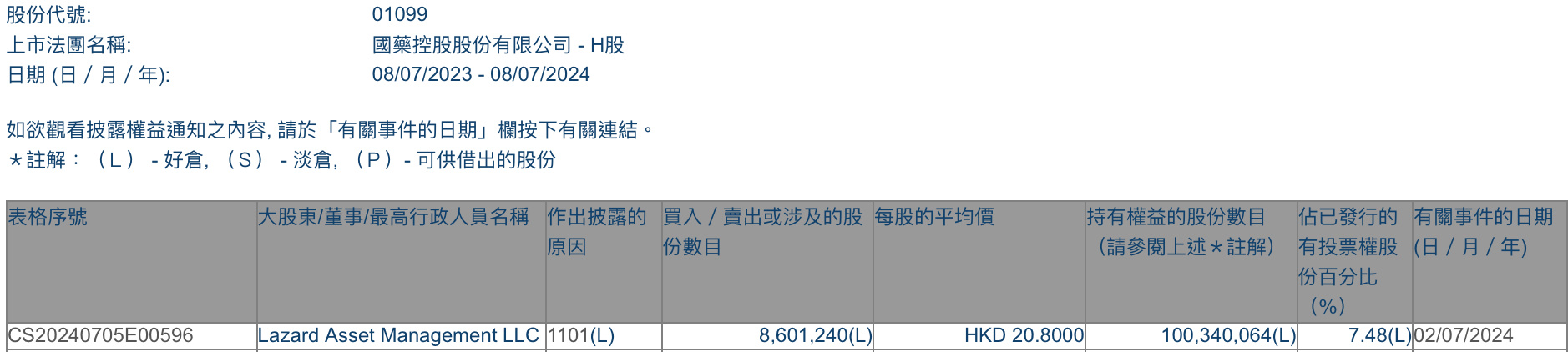 智通财经APP获悉,香港联交所最新资料显示,7月2日,Lazard Asset Management LLC增持国药控股(01099)860.124万股,每股作价20.8港元,总金额约为1.79亿港元。增持后最新持股数目约为1.0亿股,最新持股比例为7.48%。