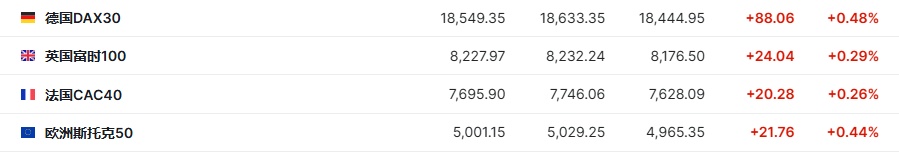 2. 截至发稿,德国DAX指数涨0.48%,英国富时100指数涨0.29%,法国CAC40指数涨0.26%,欧洲斯托克50指数涨0.44%。
