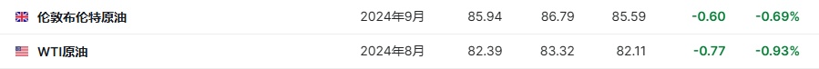 3. 截至发稿,WTI原油跌0.93%,报82.39美元/桶。布伦特原油跌0.69%,报85.94美元/桶。