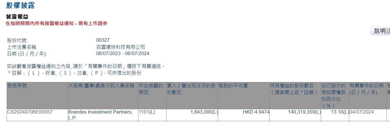 L.P.增持百富环球(00327)164.3万股,每股作价4.9474港元,总金额约为812.86万港元。增持后最新持股数目约为1.40亿股,最新持股比例为13.10%。