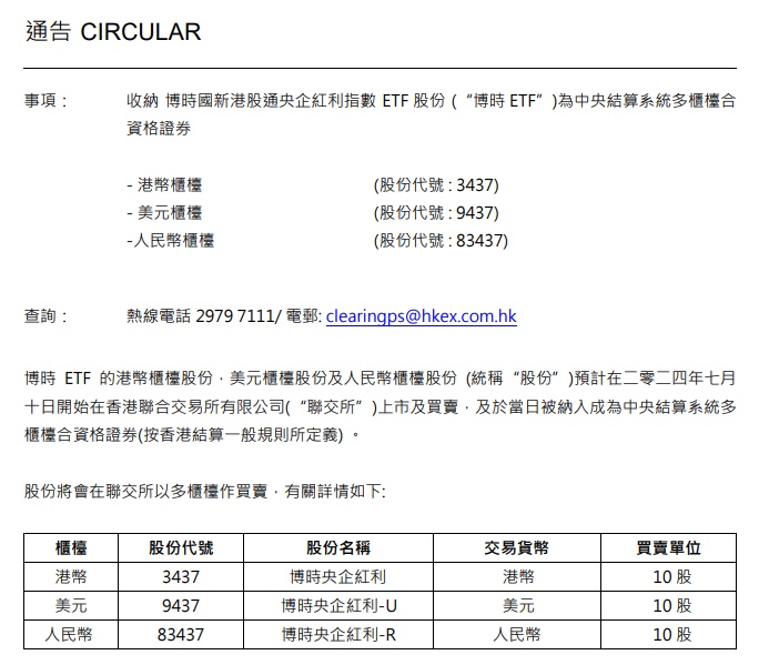 智通财经APP获悉,港交所发布公告称,博时国新港股通央企红利指数ETF股份(博时ETF)的港币柜台股份,美元柜台股份及人民币柜台股份(统称“股份”)预计7月10日开始在香港联合交易所有限公司(“联交所”)上市及买卖,并于当日被纳入成为中央结算系统多柜台合资格证券(按香港结算一般规则所定义)。