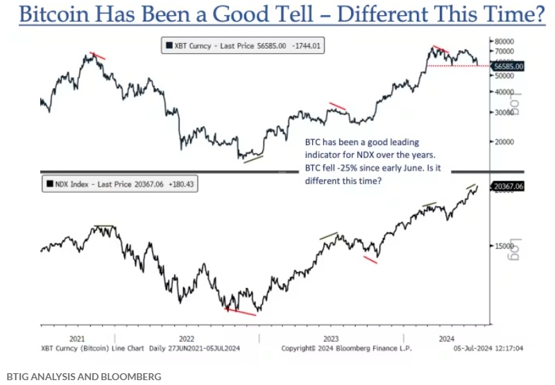 首席市场技术分析师Jonathan Krinsky也强调了股票可能面临的风险,因为比特币自6月初以来已经下跌超过25%。Krinsky在周日的报告中写道,“比特币多年来一直是纳斯达克100指数的良好领先指标”。