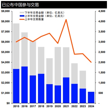 智通财经APP获悉,7月9日,路孚特发布《2024上半年并购报告和排行榜》显示,在2024年上半年,在全球范围内涉及中国大陆企业的并购总额达到了1,140亿美元。与去年同期相比下降了22.1%,与前一季度相比下降了20.3%。已公布的交易数量达到2,004笔,与2023年上半年相比下降了17.2%,与前一季度相比下降了12.5%。