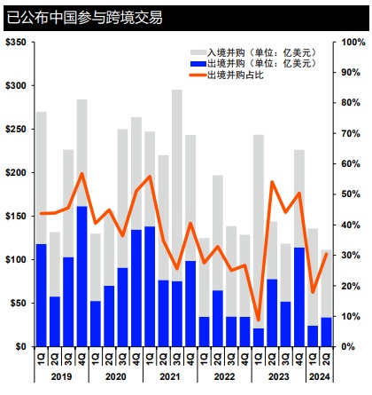 中国大陆企业“走出去”并购总额为58亿美元,与2023年上半年相比下降了41.3%。“引进来”并购总额为189亿美元,与2023年上半年相比下降了34.5%。境内并购总额为769亿美元,与2023年上半年相比下降了24.1%。