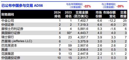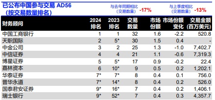 在财务顾问排名方面,中金公司在2024年上半年已公布的涉及中国大陆企业并购排行榜中位列第一,市场份额为6.64%,相关交易价值为74亿美元。中信证券紧随其后,市场份额为6.57%。摩根士丹利证券位居第三,市场份额为5.28%。就交易数量而言,中国工商银行、天职国际和中金公司排名前三。
