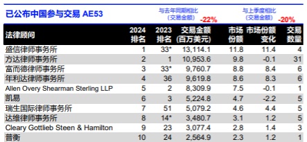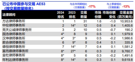 在相关交易价值方面,盛信律师事务所、方达律师事务所和富而德律师事务所在2024年上半年已公布的涉及中国大陆企业并购排行榜中排名前三。在交易数量方面,方达律师事务所、中伦律师事务所和竞天公诚律师事务所位于前三名。