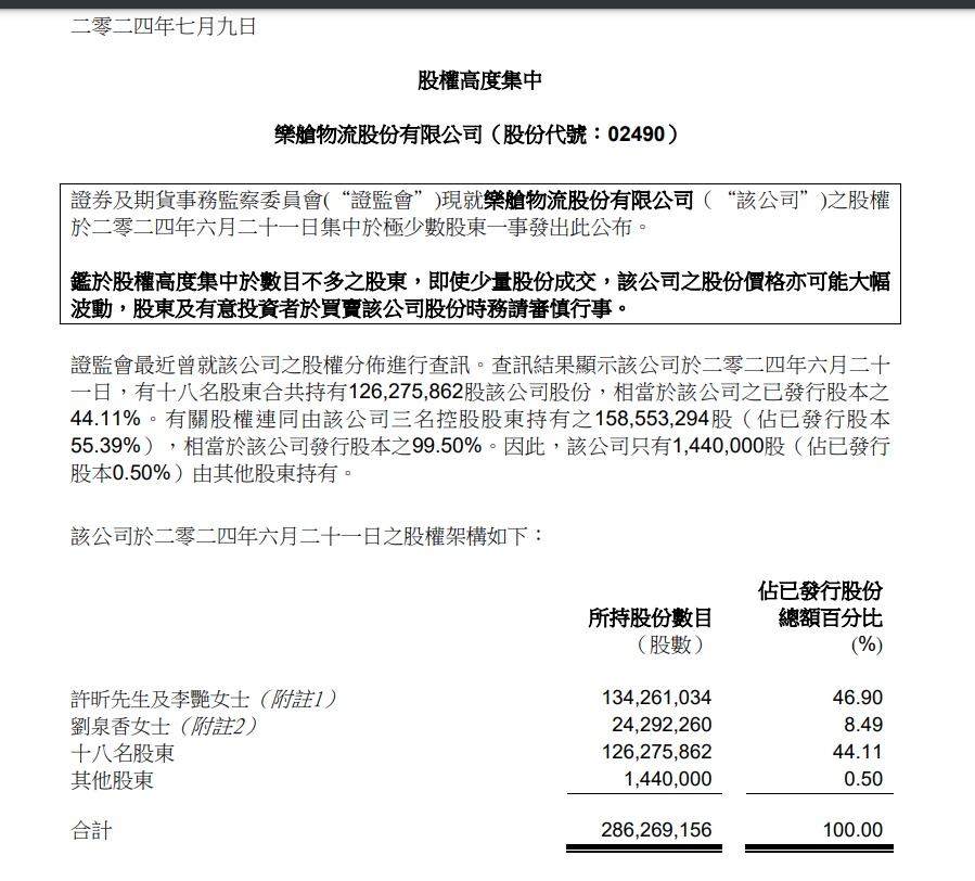 换言之,乐舱物流于6月21日只有144万股(占已发行股本0.5%)由其他股东持有,属股权集中于极少数股东。香港证监会指,鉴于股权高度集中于数目不多之股东,即使少量股份成交,其股价亦可能大幅波动,提醒股东及有意投资者买卖时务请审慎行事。