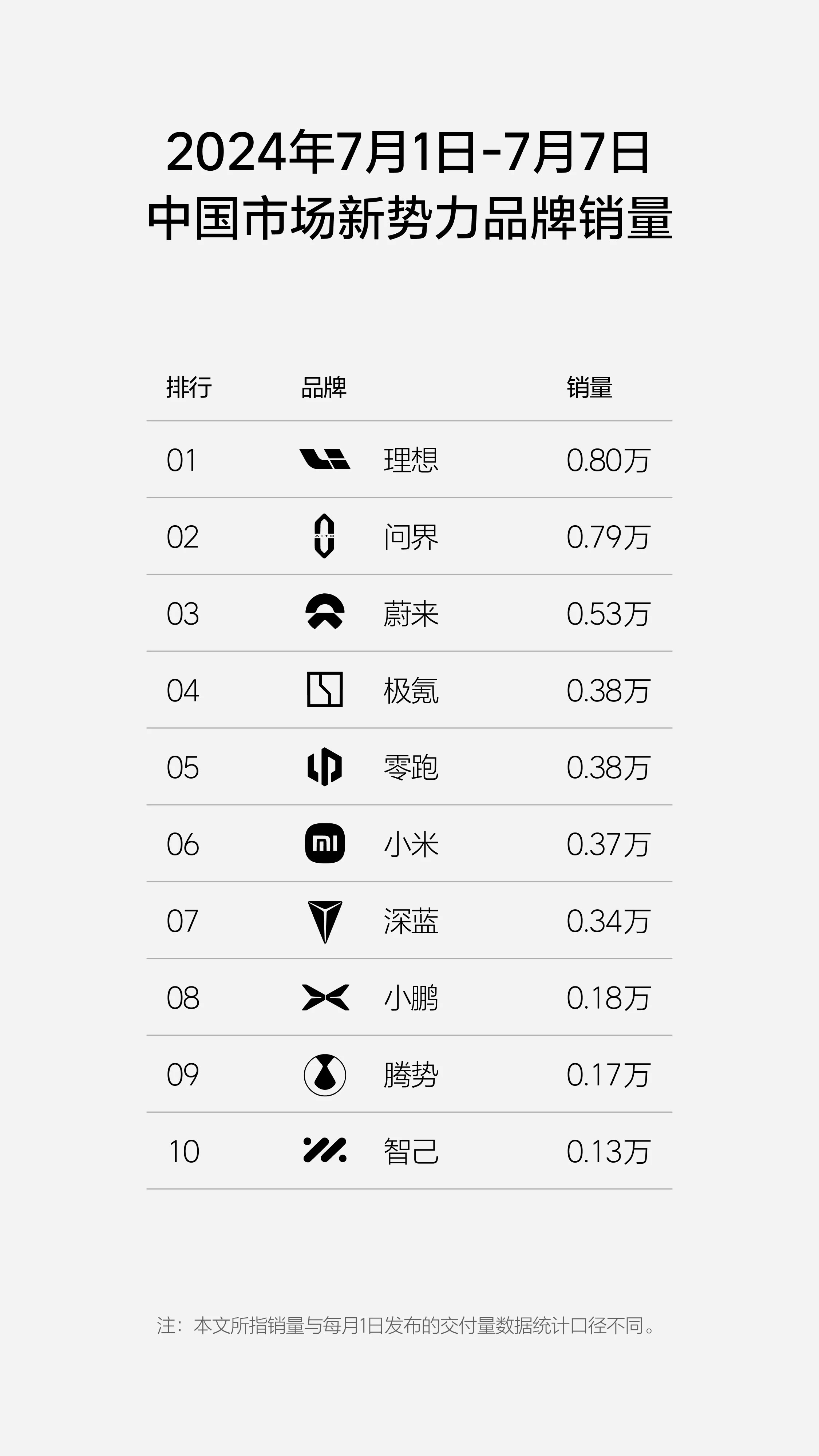 智通财经APP获悉,理想汽车(02015)2024年第27周(7.1-7.7)周销量达0.8万辆,连续11周获中国市场新势力品牌销量第一。