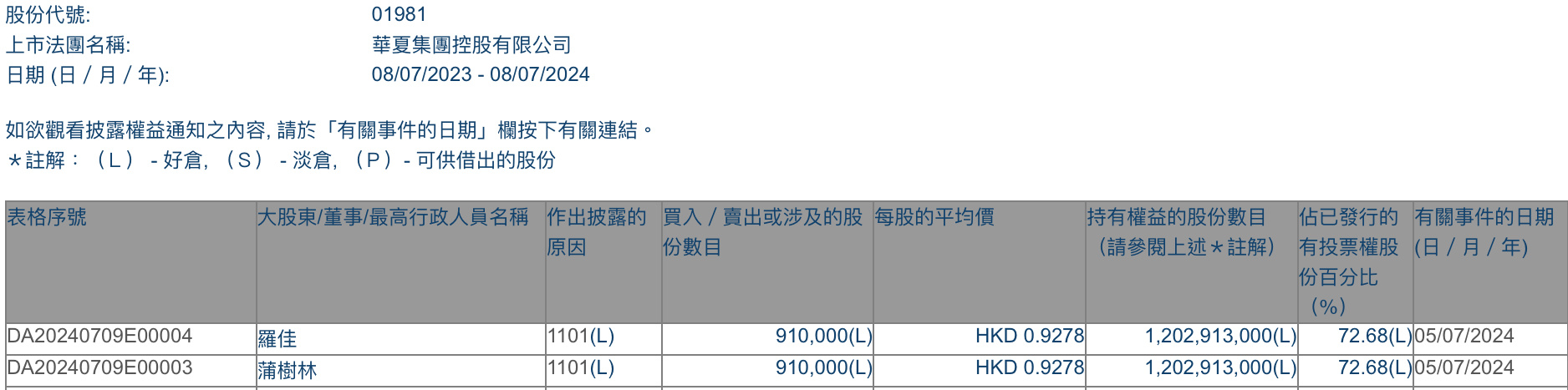 智通财经APP获悉,香港联交所最新资料显示,7月5日,董事长蒲树林增持华夏控股(01981)91万股,每股作价0.9278港元,总金额约84.4298万港元。增持后最新持股数目约为12.029亿股,最新持股比例为72.68%。