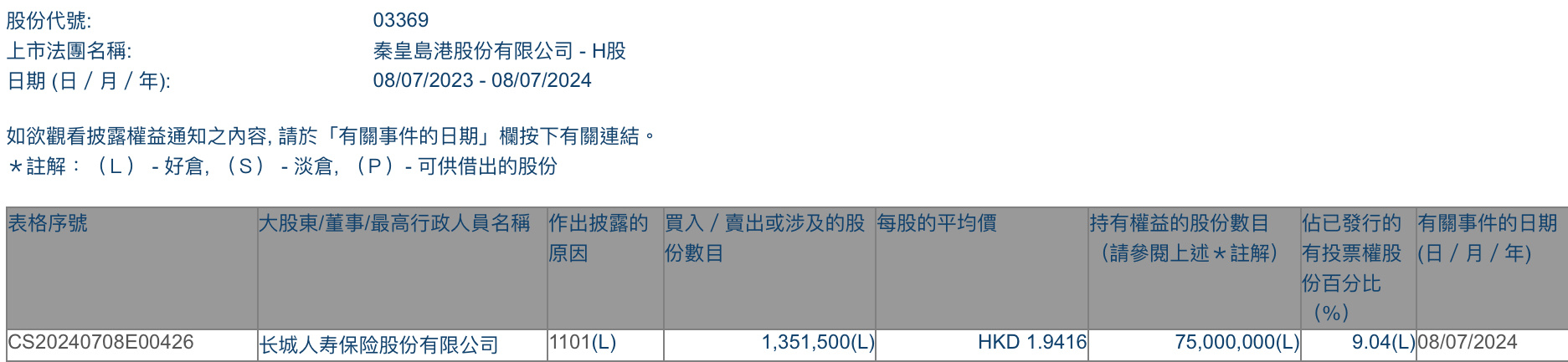 智通财经APP获悉,香港联交所最新资料显示,7月8日,长城人寿增持秦港股份(03369)135.15万股,平均每股作价1.9416港元,总金额约为262.41万港元。增持后最新持股数目为7500万股,持股比例为9.04%。
