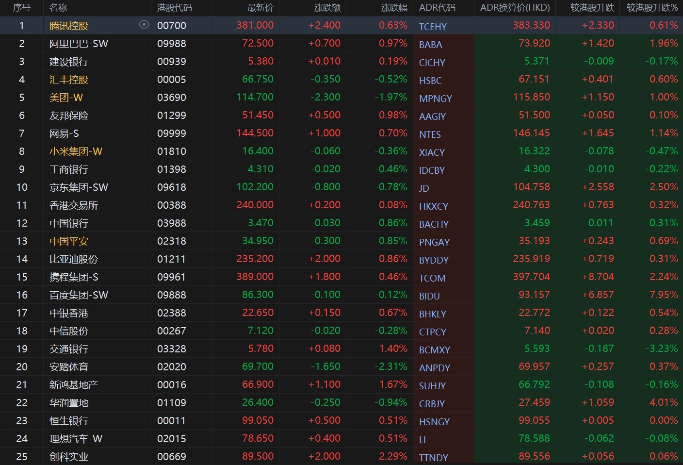 大型蓝筹股涨跌不一,汇丰控股收报67.151港元,较香港收市涨0.60%;腾讯控股收报383.330港元,较香港收市涨0.61%。