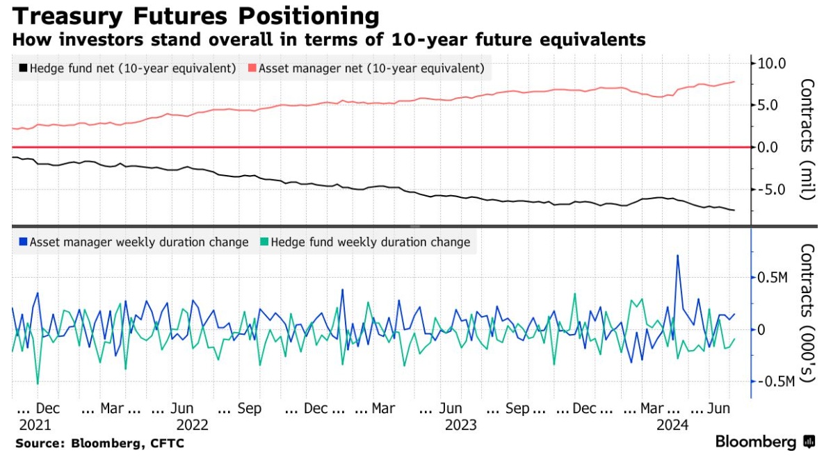 自7月1日以来的每日仓位数据显示,在美联储主席向国会作证和本周公布消费者价格指数(CPI)之前,交易员正在建立看涨债券的押注。如果鲍威尔的讲话或周四公布的通胀数据支撑了今年降息的预期,这些押注将受益。