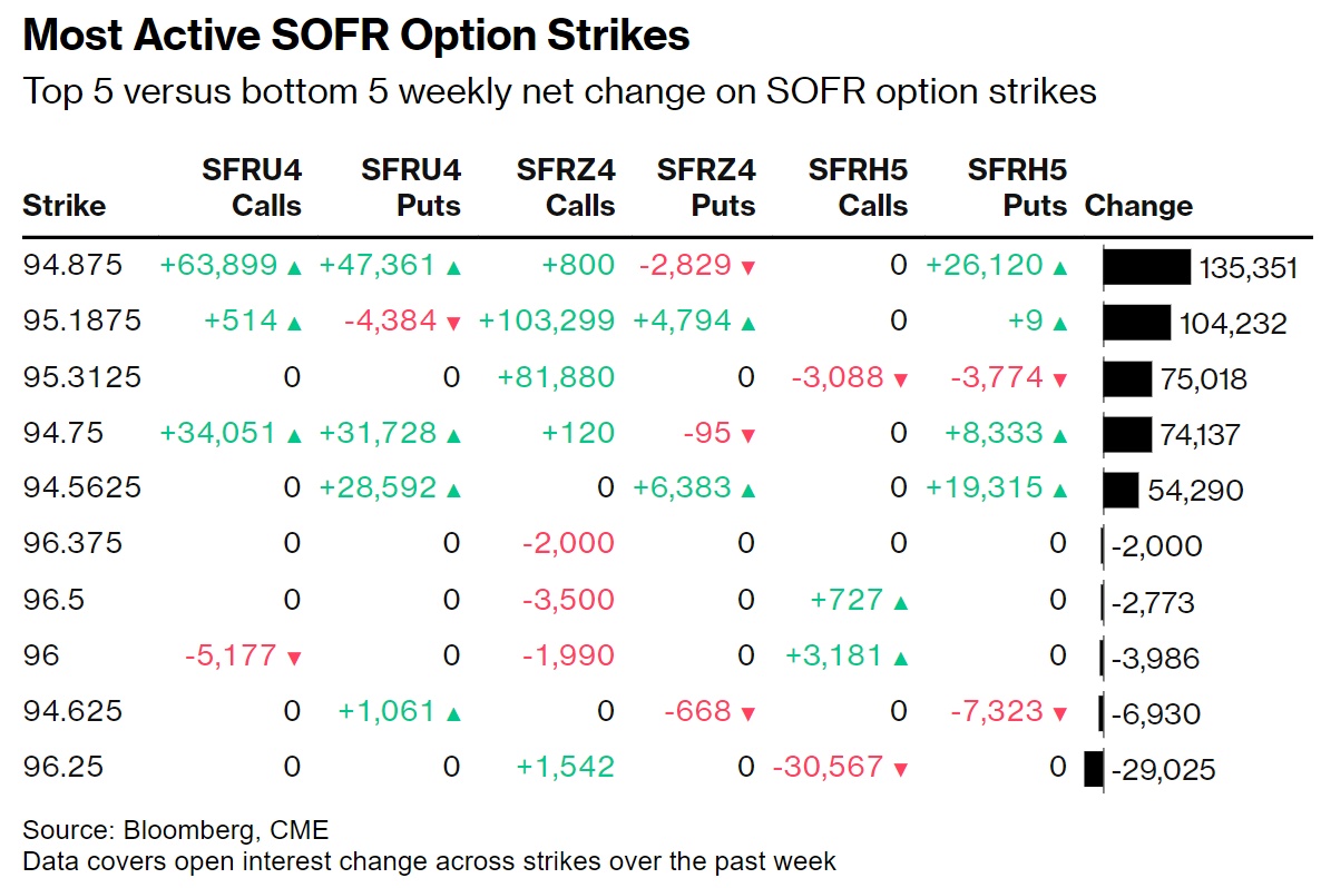 在 2025 年 3 月到期的 SOFR 期权中,由于通过 9 月 24 日的看涨期权和看跌期权增加了大量头寸,94.875 执行价现在拥有最多的未平仓合约。最近的流动包括购买 SFRU4 94.75/94.875/95.00 看涨期权。94.625 执行价也保持活跃,最近的流动包括 SFRU4 94.6875/94.625 1x2 看跌价差和 SFRU4 94.875/94.75/94.625 看跌期权,以及最近活跃的SFRU4 94.6875/94.625 1x2 看跌价差。