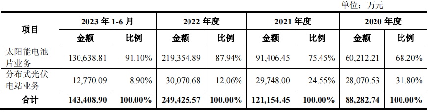 据招股书,公司成立于2008年,系一家聚焦于光伏行业的清洁能源服务商,主营业务为太阳能电池片的研发、生产与销售,以及分布式光伏电站的投资运营、开发建设及服务,目前已形成“太阳能电池片+分布式光伏电站”双轮驱动的业务格局。于2020年-2023年上半年,公司主营业务收入占营业收入的比例在97%以上。
