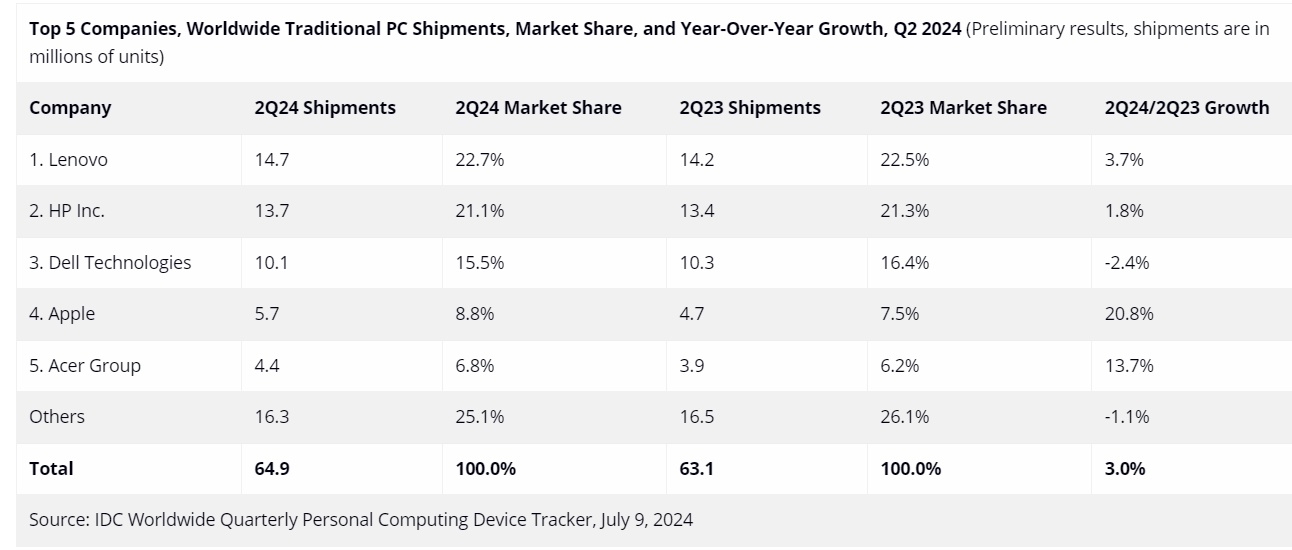 从IDC详细数据来看,在全球前五大PC厂商中,联想Q2出货量高达1470万台,出货量高居榜首,同比增长3.7%;惠普在当季则以出货1370万位居次席,出货量同比增长1.8%;排在第三的戴尔出货约1010万台,同比则下降2.4%;苹果当季出货大约570万台,出货量名列第四,但实现同比增长20.8%,增幅最大;增幅紧随其后的宏碁当季出货440万台,同比增长近14%。