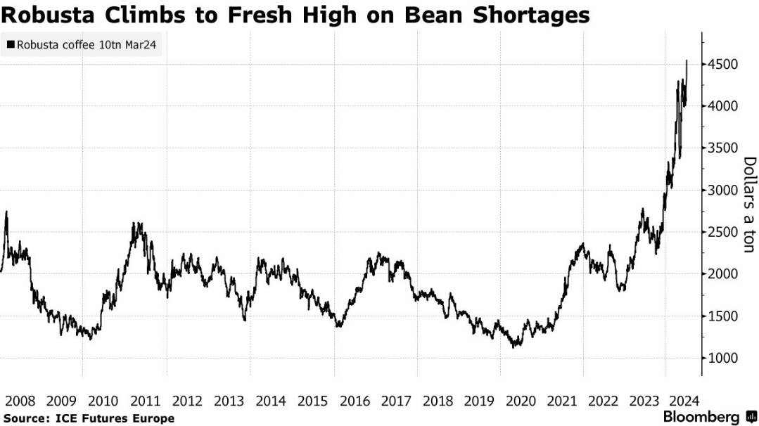 同时,巴西的阿拉比卡咖啡豆——另一种主要的咖啡豆品种——也因恶劣天气而价格飞涨。周二,其期货交易价格达到了两年来的新高。2023年末的干旱对作物生长造成了影响,导致一些农民收获的咖啡豆尺寸小于往年,进一步加剧了供应紧张。