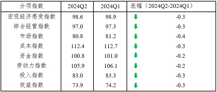 分项指数均有所下降。如下表所示,二季度,宏观经济感受指数、综合经营指数、市场指数、成本指数、资金指数、劳动力指数、投入指数、效益指数均由升转降,较一季度分别下降0.3、0.3、0.4、0.3、0.2、0.2、0.3、0.3点。从景气状况看,资金指数和劳动力指数处于景气临界值100以上,宏观经济感受指数、综合经营指数、市场指数、投入指数和效益指数均处于景气临界值100以下,成本指数仍处于不景气区间,效益指数处于最低位。