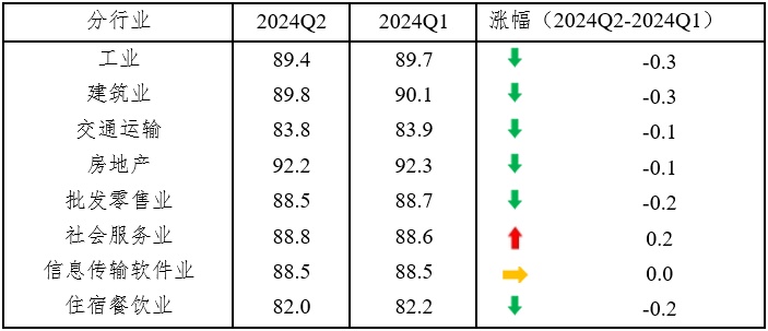 分行业指数1升1平6降。如下表所示,二季度,社会服务业指数比一季度上升0.2点。信息传输软件业指数与一季度持平。工业、建筑业、交通运输业、房地产业、批发零售业、住宿餐饮业指数比一季度分别下降0.3、0.3、0.1、0.1、0.2和0.2点。其中,社会服务业订单、销售、流动资金、效益指数均有所上升。房地产业订单、销售指数有所上升,生产、库存、价格、效益指数有所下降。