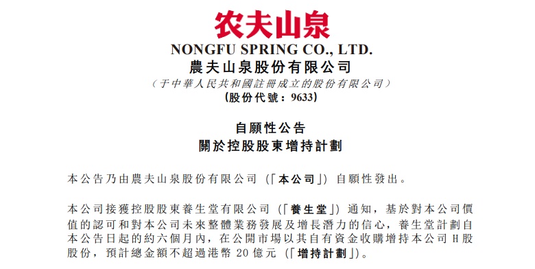 7月9日港股收盘后,农夫山泉(09633)发布公告称,其控股股东养生堂计划在约六个月内,以自有资金在公开市场增持公司H股股份,预计总金额不超过20亿港元。农夫山泉表示,养生堂的增持计划反映了控股股东对公司做出的长期承诺以及对公司前景的坚定信心。