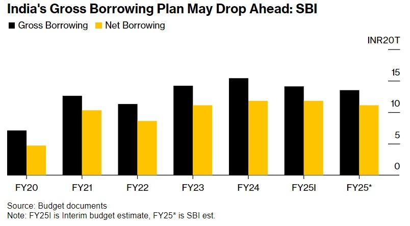印度预算计划有望促使印度债券收益率下降。根据高盛和印度国家银行的预测,印度政府可能会进一步减少其债券市场借款,而此前预算为14.13万亿卢比。高盛预计总发行量将减少5000亿卢比,而印度国家银行预计将减少6000亿卢比。这将令市场感到高兴,因为市场已经预计需求将超过债券供应,而且考虑到印度总理纳伦德拉·莫迪的两个关键盟友的财政需求,这将是一个惊喜。如果债券发行量减少的预测成真,收益率可能会下降。