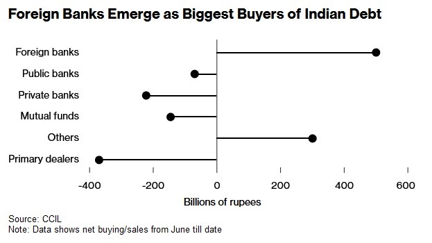 最近几周,受印度经济前景和稳定货币吸引,外资银行成为印度万亿美元主权债券市场的最大投资者。根据印度清算公司的数据,自6月1日以来,外资银行已经购买了超过5000亿卢比(约合60亿美元)的印度主权债券。这一规模远超同一时期内约2000亿卢比的指数债券净流入规模,表明通常作为客户托管人购买债券的全球性银行也在为自己的账户抢购这些债券,这其中包括德意志银行和汇丰控股等。