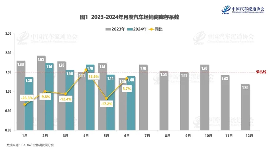 智通财经APP获悉,7月10日,中国汽车流通协会发布2024年6月份“汽车经销商库存”调查结果,6月份汽车经销商综合库存系数为1.40,环比下降2.8%,同比上升3.7%,库存水平位于警戒线以下。