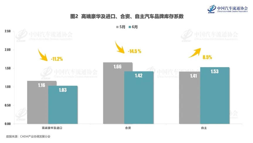 高端豪华&进口品牌库存系数为1.03,环比下降11.2%;合资品牌库存系数为1.42,环比下降14.5%;自主品牌库存系数为1.53,环比上升8.5%。