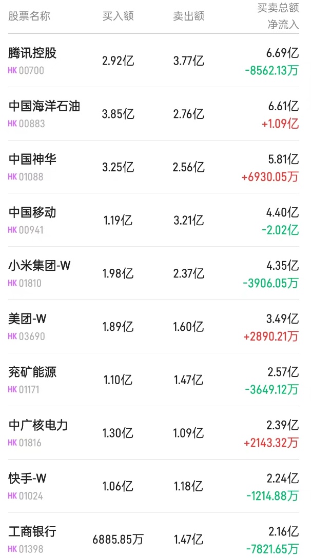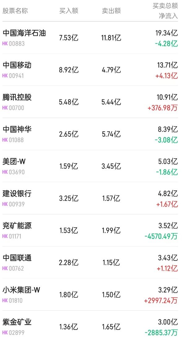 北水净买入最多的个股是中国移动(00941)、建设银行(00939)、中国联通(00762)。北水净卖出最多的个股是中海油(00883)、中国神华(01088)、兖矿能源(01171)。
