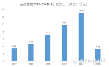 值得一提的是,在资金紧张的情况下,荣昌生物并没有跟降本增效。数据显示2019年至2024年Q1,荣昌生物研发投入分别为3.52亿元、4.66亿元、7.11亿元、9.82亿元、13.06亿元及3.31亿元,合计41.48亿元。