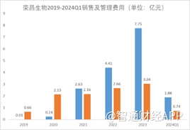 此外,2019年至2024Q1,荣昌生物销售费用分别为0.01亿元、0.24亿元、2.63亿元、4.41亿元、7.75亿元及1.87亿元,合计16.92亿元。