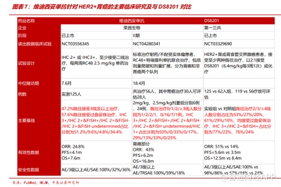 全球已获批用于治疗胃癌的HER2 ADC有维迪西妥单抗、DS8201,维迪西妥单抗通过 C008 研究(NCT03556345)获批治疗 HER2+3L+胃癌,在该研究中实现了疗效的同时表现出安全性优势(3级以上不良反应发生率及严重不良反应发生率低DS8201在HER2+3L+胃癌注册临床研究DESTINY-Gastric01实验组中的水平)。有效性数据方面,维迪西妥单抗ORR=43%、PFS=6.2m、 OS=16.8m,显现维迪西妥单抗在HER2 中低表达胃癌患者的治疗潜力。