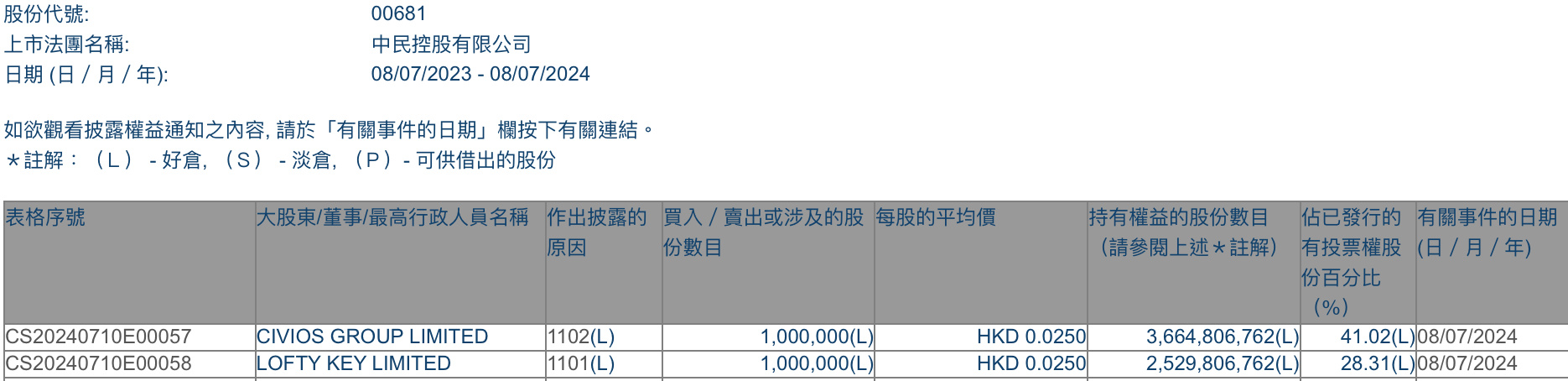 智通财经APP获悉,香港联交所最新资料显示,7月8日,LOFTY KEY LIMITED增持中民控股(00681)100万股,平均每股作价为0.025港元,总金额约2.5万港元。增持后最新持股数目约为25.298亿股,持股比例为28.31%。