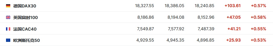 2.截至发稿,德国DAX指数涨0.57%,英国富时100指数涨0.58%,法国CAC40指数涨0.55%,欧洲斯托克50指数涨0.53%。