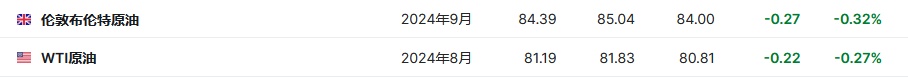 3.截至发稿,WTI原油跌0.27%,报81.19美元/桶。布伦特原油跌0.32%,报84.39美元/桶。