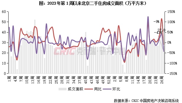 2024年第27周,北京二手房成交面积27.0万平方米,环比下降43%,同比下降9%,较周平均增长5%。