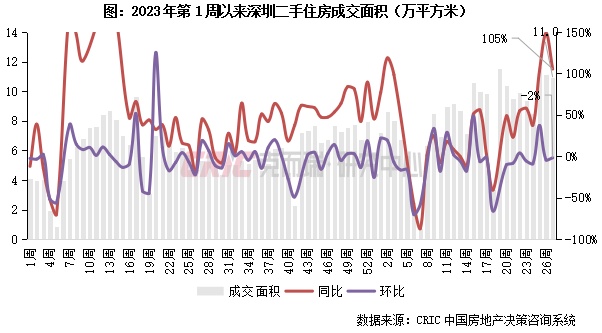 2024年第27周,深圳二手房成交面积11.0万平方米,环比下降2%,同比增长105%,较周平均增长34%。
