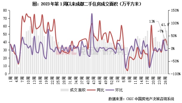 同比增幅收窄至13%2024年第27周,成都二手住房成交面积41.9万平方米,环比下降7%,同比增长13%,较周均值增长11%。
