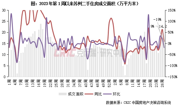 环比下降19%2024年第27周,苏州二手住房成交面积14.2万平方米,环比下降19%,同比增长9%,较周平均增长18%。