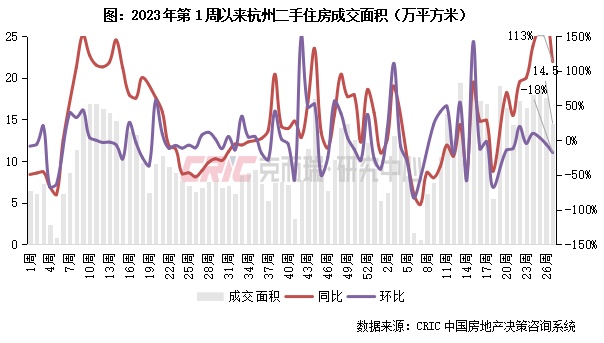 2024年第27周,杭州二手住房成交面积14.5万平方米,环比下降18%,同比增长113%,较周平均增长16%。