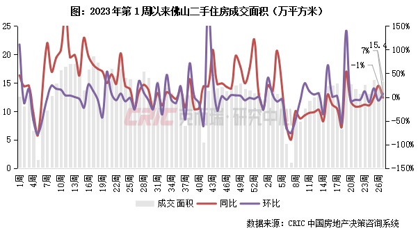 2024年第27周,佛山二手住房成交面积15.4万平方米,环比增长7%,同比下降1%,较年内周平均增长27%。